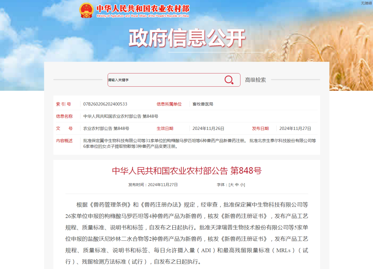 據2024年11月27日農業(yè)農村部網站發(fā)布的中華人民共和國農業(yè)農村部公告第848號,山西瑞象生物藥業(yè)有限公司與瑞普(天津)生物藥業(yè)有限公司等單位合作研發(fā)的“鹽酸沃尼妙林二水合物可溶性粉”獲批國家三類新獸藥證書。